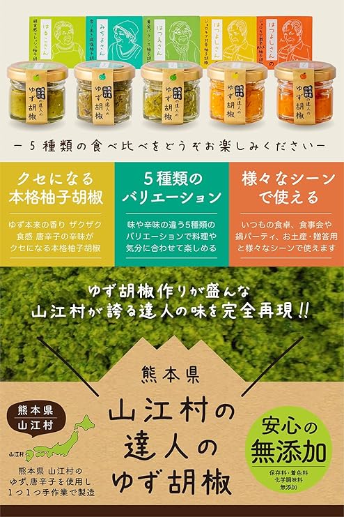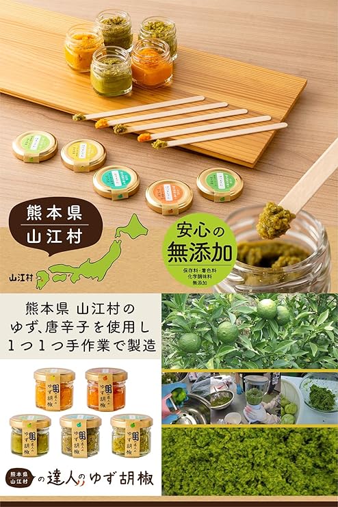 ゆず胡椒が注目される理由は、その奥深い味わいにあります。ゆず本来の爽やかな香りと、青唐辛子のピリッとした辛味が絶妙にバランスを取り、料理の味を引き立てます。また、ゆず胡椒には、ビタミンCやカプサイシンなど、美容や健康にも嬉しい成分が豊富に含まれていることも魅力の一つです。今回は、金賞を受賞するほど人気の山江村の達人のゆず胡椒5種類のポイントやおすすめの食べ方についてご紹介します。