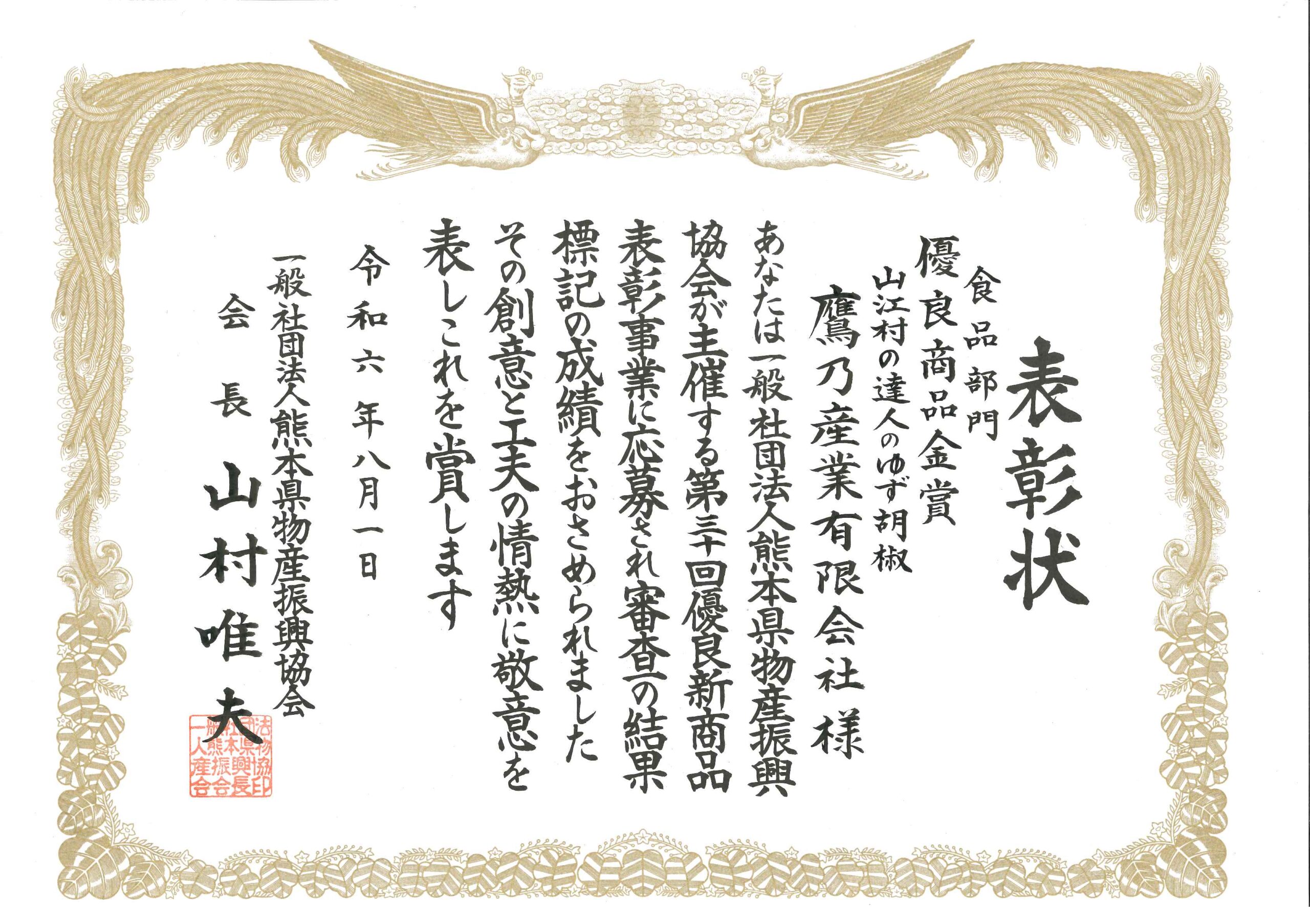 この度、共栄アグリは一般社団法人 熊本県物産振興協会が主催の『令和6年度(2024年度)優良新商品審査会』において、弊社の商品「山江村の達人のゆず胡椒」が優良商品の金賞を受賞しました!