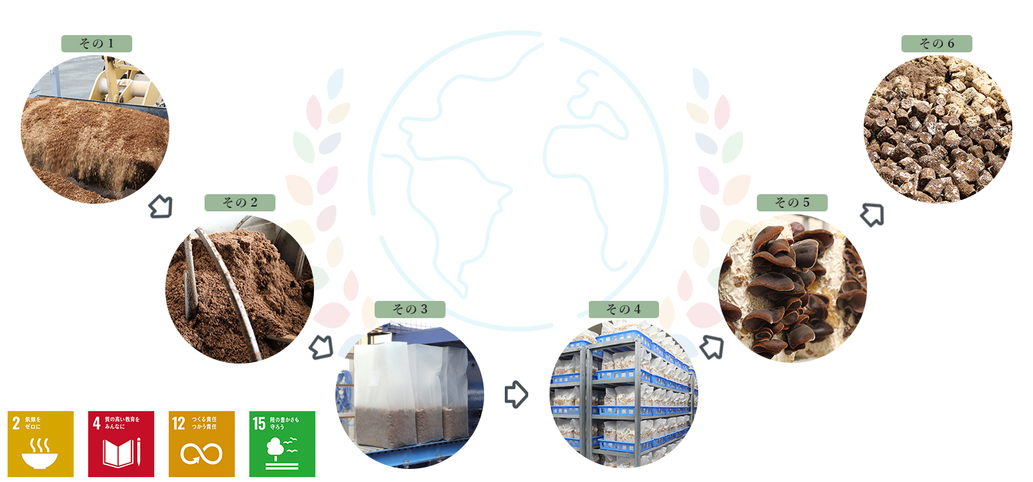 間伐材の使用や廃菌床の再利用をして、循環型の農業を行う。